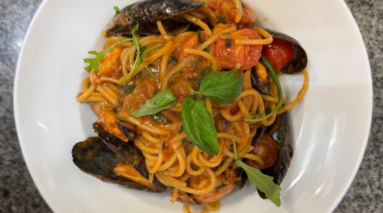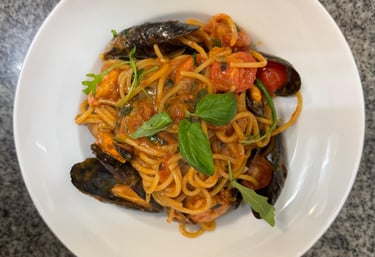 Pasta with Clams, Mussels Cherry tomato, garlic & white wine