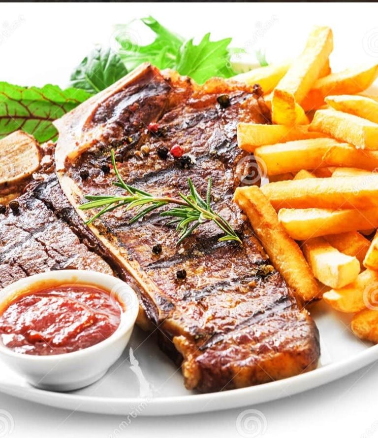 Serve with French fries, green salad & steam rice
